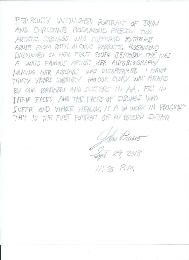 “Purposely unfinished portrait of John and Christine Rosamond Presco, two artisitic siblings who suffered extreme abuse from both alcoholic parents. Rosamond drowned on her first sober birthday. She was a world famous artist. Her autobiography naming her abusers, was disappeared. I have thirty years sobriety. Our story was heard by our brothers and sisters in AA. Fill in their faces, and the faces of siblings who suffer, and whose healing is a work in progress. This is the first portrait of my beloved sister.”