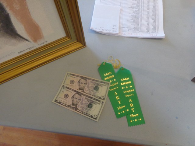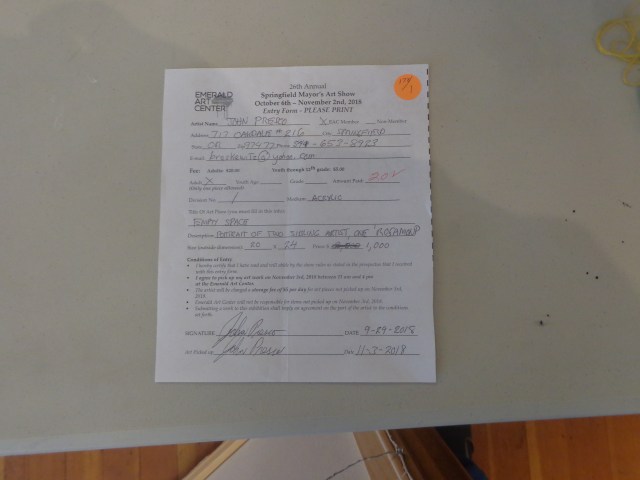 Yesterday I went with my Good Neighbor to get my painting at the Mayor’s show at the Emerald Art Association. I was shocked to see ‘Empty Space’ had gotten two awards. It was hard to look at the two five dollar bills that were laid out on the table before me. I smiled at the irony of seeing two Honest Abes side by side. There was nothing honest about the success of Christine Rosamond Benton but for the question she asked me in her home, when this image was taken. Did I give my beloved sister – an honest answer?