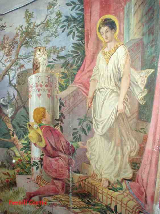 Penkill Castle played a minor part in the history of the British Pre-Raphaelite movement. In the late 1850s, the Pre-Raphaelite artist William Bell Scott began a liaison with Alice Boyd, whose brother was then the laird. Scott visited Penkill often and on one occasion painted a series of murals illustrating James I‘s poem The Kingis Quair in the staircase. Scott died at Penkill on 22 November 1890.[3] The castle was frequented by other Pre-Raphaelite artists and writers, including Christina Rossetti, who wrote of it: “Even Naples in imagination cannot efface the quiet fertile comeliness of Penkill in reality.”[4]