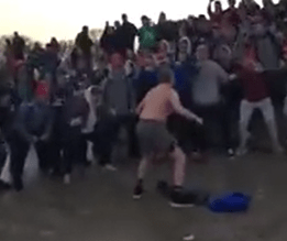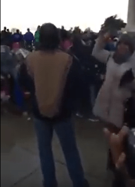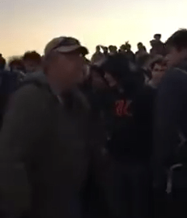 A group of CC step in between the Philips and the HB, and approach them. They want to hear and read their message. Hearing the cussing, there is anger. A coach, or teacher, asks the CC several times to back up.