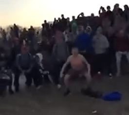 Then the BH notices a crowd is forming on the steps in back of them. They note they have taken the HIGHGROUND, and are quickly outnumbered. This is noted verbally. The sight of the Red Caps creates tension. The BH feels physically threatened. They do not want to appear to be cowards who betray their God. They rain down verbal abuse on the Colonel Crazies, who do a native WAR CHANT. The BH are amazed by the actions of the CC that the NA have noticed. Sensing violence is coming, Philips moves between the two groups – to make peace. The CC think at first the NA have joined them, and do their Aborigine dance. But then Philips is seen as being on the side of the BH.