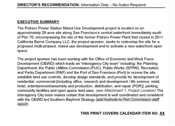 California Barrel Company LLC, the project sponsor, proposes to redevelop the site of the former Potrero Power Plant and adjacent parcels located along San Francisco’s central bayside waterfront with a variety of residential, commercial, parking, community facilities, and open space land uses. The San Francisco Planning Department has determined that an environmental impact report (EIR) is required for the proposed project in compliance with the California Environmental Quality Act and on October 3, 2018, published a Draft EIR on the project. The purpose of the Draft EIR is to inform governmental agencies and the public of the potential environmental impacts of the proposed mixed-use development, recommended mitigation measures to lessen significant adverse impacts, and comparative merits of alternatives to the project. On October 8, 2018, the proposed project was certified by the Governor of California as an environmental leadership development project under the Jobs and Economic Improvement Through Environmental Leadership Act of 2011 (California Public Resources Code section 21178 et seq.). Beginning on October 3, 2018, pursuant to the requirements of this act and concurrent with the administrative process, this website provides access to all documents and materials in the record of proceedings for this project in a downloadable format.