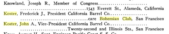 He has voted with the republican party and has always positively refused to consider political office of any kind, although he has given freely of his time and energy to welfare and civic work. During the World war, he was chairman of the resources and conversion section of the War Industries Board for the states of California, Nevada and Arizona, and was chairman of the local committee in charge of the campaign for Armenian and Syrian relief, and a member of the European relief administration. He is now a member of the National Foreign Trade Council. He was a director of the Chamber of Commerce of the United States, chairman of its executive committee and chairman of its committee on American ideals. He served three terms as president of the San Francisco Chamber of Commerce, and was chairman of the Law and Order Committee during the serious strike situation in San Francisco in 1916 and until its discontinuance in 1919. He also served three terms as president of the Industrial Association of San Francisco. At present he is chairman of the San Francisco Endorsement Council, president of the California State Chamber of Commerce, and president of the California Grape Control Board, Ltd., which is striving to reestablish the distressed grape industry in the state of California. Socially he has connection with the Pacific Union, Bohemian, Olympic, San Francisco Commercial, Commonwealth and Woodside Country Clubs and the Meadow Club of Tamalpais. Through his own exertions Mr. Koster has risen to the top, winning gratifying success as well as the high esteem and good will of his fellowmen. Prompted by humanitarian instincts, he has steadily broadened his field of usefulness and his far reaching labors have been productive of much good.