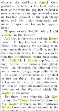 Throughout his career Frederick J. Koster has been identified with industrial activities and in manufacturing circles of San Francisco, his native city, he has long figured prominently as president of the California Barrel Company, Ltd. He was born October 28, 1868, a son of John L. and Berta Lisette (Wagener) Koster, and supplemented his public school education by private instruction and study. In 1884, before he attained the age of sixteen, he entered the employ of the San Francisco establishment of the Coos Bay Stave & Lumber Company as an apprentice to learn the cooperage trade and made rapid headway, due to his conscientious application and capable performance of every task assigned him. In 1887 he became superintendent of the plant of the California Barrel Company, now the California Barrel Company, Ltd., and since 1905 has served as president of this large corporation, wisely administering its affairs. His life has been devoted to the building up of this business, and his company occupies an outstanding position in the United States in its line. The thing in which Mr. Koster takes the greatest pride is the close relationship that exists among his fellow workers, to whom he never refers as employes, and the spirit of comradeship and cooperation that pervades his business institution. This and the resultant spirit of service to the trade is what he considers his greatest asset.