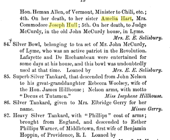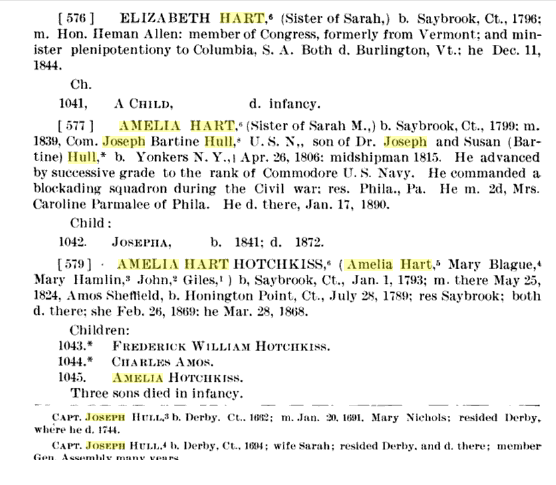 “Amelia, sixth daughter, married Captain, afterward Commodore Joseph HULL, U. S. N., a nephew of Commodore Isaac HULL. Three of the (Hart) daughters died unmarried.”