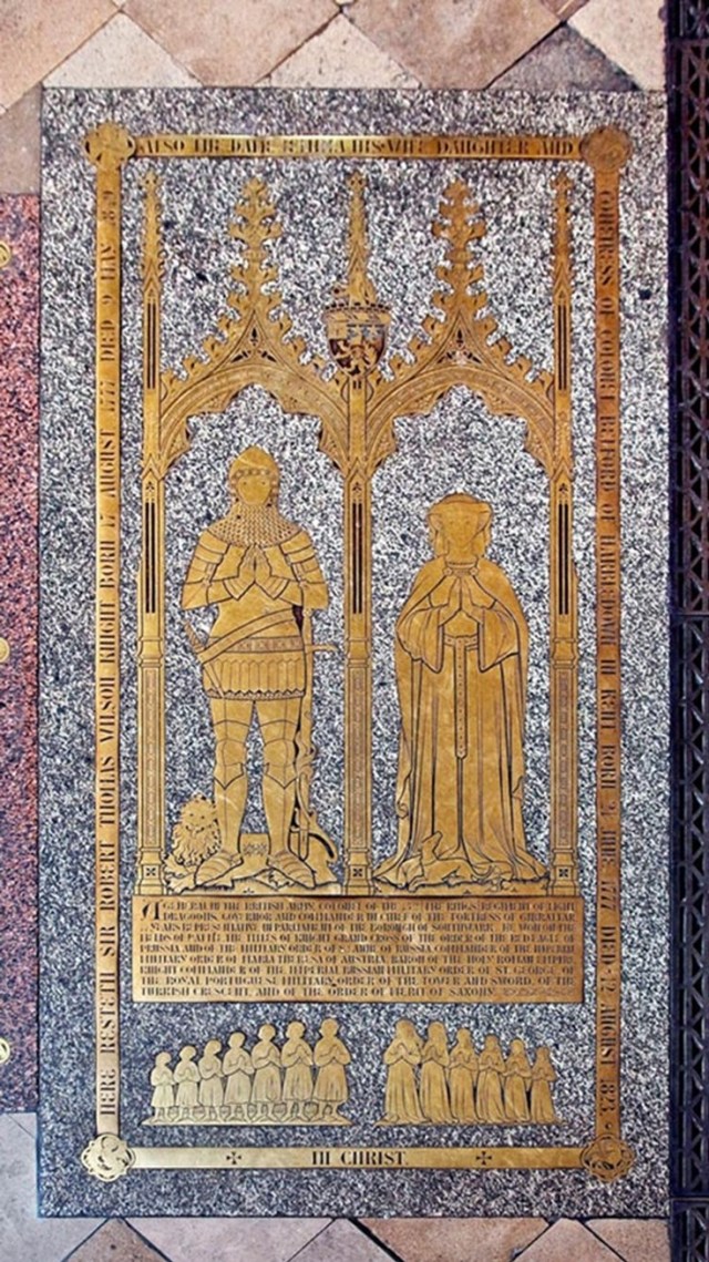 In the north aisle of the nave of Westminster Abbey is a brass covering the grave of Sir Robert Thomas Wilson and his wife. The stone is grey Cornish marble with brass made by Hardmans of Birmingham. The main figures are in the style of a medieval knight and his lady under a canopy with a lion at his feet and a dog at hers. Below are shown their seven sons and six daughters, again in medieval dress. In the canopy is a coat of arms: “a wolf rampant, in chief three stars of six points, on a canton an eagle displayed with two heads”, with a demi wolf holding a crescent as his crest. The inscription in the surround reads:
