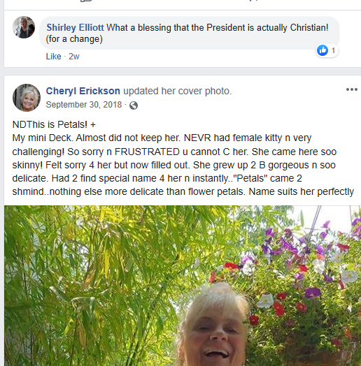I took note that Cheryl only had one friend, named Trixie, who is a Jesus Freak and caregiver for the mentally ill. She has posted a video of our Loony President dividing America some more. He knows he has a million mentally ill Americans – at least – backing his crazy rabble rousing. This is – CRUEL! Trixie is taking advantage of Cheyl. She is on a mission – for Christ!