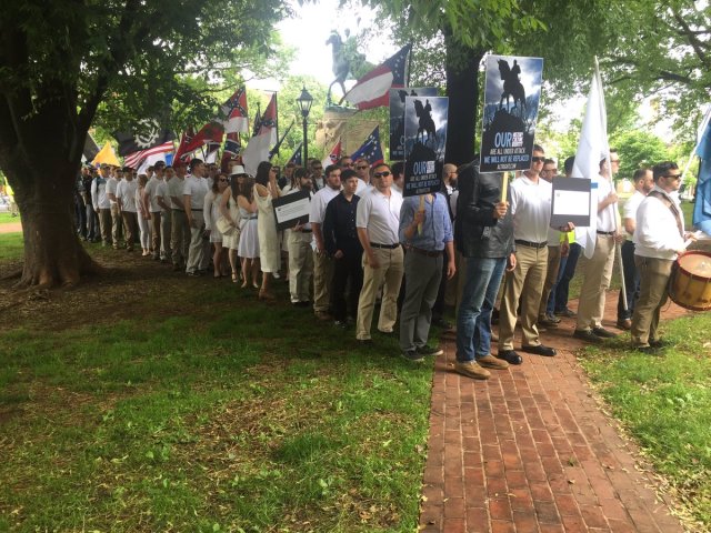 Just outside cemetery grounds stood black activists protesting the April 28 party with signs and banners saying, “Down with the Confederate flag.”
