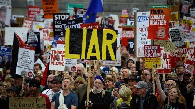 Midway through a three-day trip to Britain, Trump declared a victory of sorts, telling a news conference on Tuesday that predicted large-scale protests never materialized. Standing beside May in Durbar Court, at the Foreign Office, Trump said: “I heard that there were protests. I said, ‘Where are the protests? I don’t see any protests.’ I did see a small protest today when I came, very small, so a lot of it is fake news, I hate to say.”