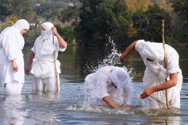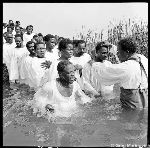 New members of the Nazareth Baptist Church are baptized close to the church headquarters near KwaMashu, KwaZulu Natal, January 1998. The founder Isaiah Shembe is seen as a spiritual descendent of Moses and Jesus, and th church embraces traditional Zulu values and customs. Photo Greg Marinovich
