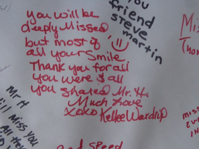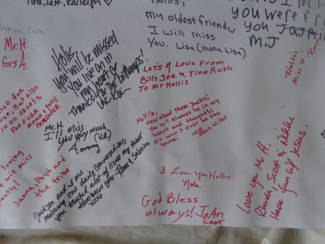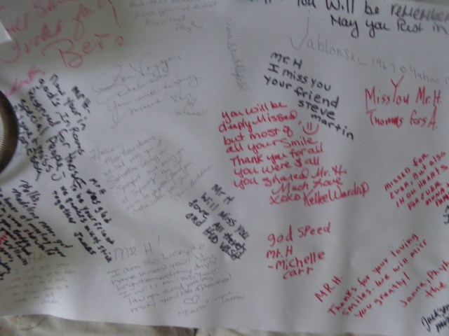 There was a light around him. H said hello to me with a beautiful smile. After H was dead, I discovered he had no family. I adopted him. But, I believe Meher Baba found Mr. Williams, and made him one with the eternal truth. It was easy, because H did not have the attachments to illusion most of us have, when we cling to our natal family. At the memorial, Hollis’s true family gathered. I lay out two scrolls near the lit candles and bid them to say Hello and Goodbye.