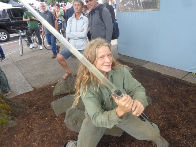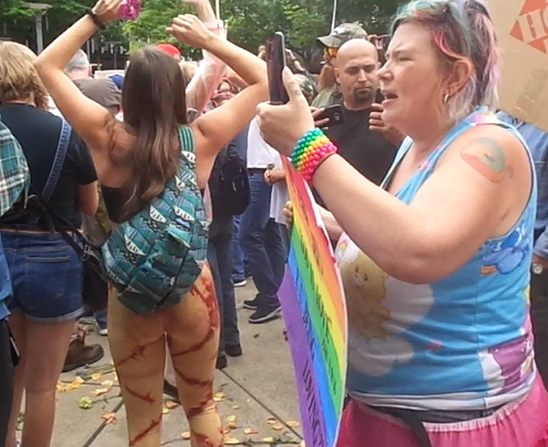 Then, when you thought there was going to be a massive shrieking feline pile-on, with fur flying everywhere, there stood a young man holding up his Tie-Dye Wear with a big grin on his face. What guts! He put himself right there at the very core of Hatred and Violence. He reminded most of us, that the Saturday Marker is happening thirty feet across the road.