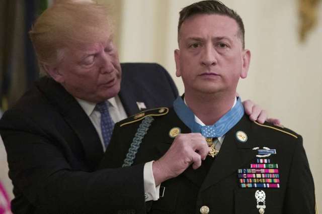 At the event in Louisville, Kentucky, Trump singled out for praise WWII veteran and Medal of Honor recipient Woody Williams.