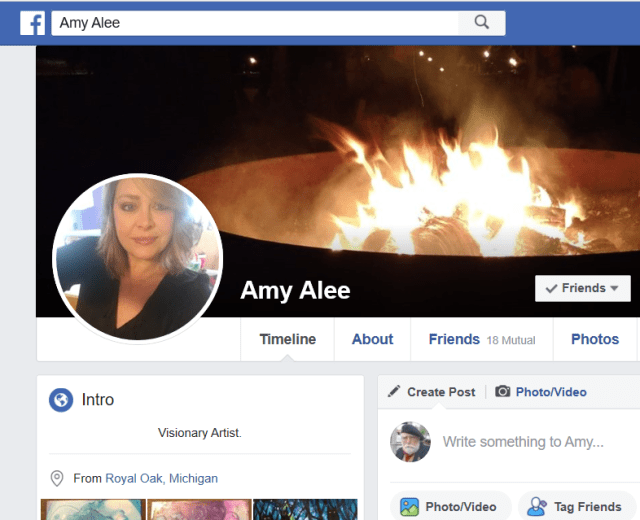 Amy knew I was fighting witches in the streets of my town. I have talked to the FBI. Not one word of encouragement did she give me. Why? Was she afraid her fellow witches would gang up on her on FB, and, the value of her art work goes down? No one buys her art.