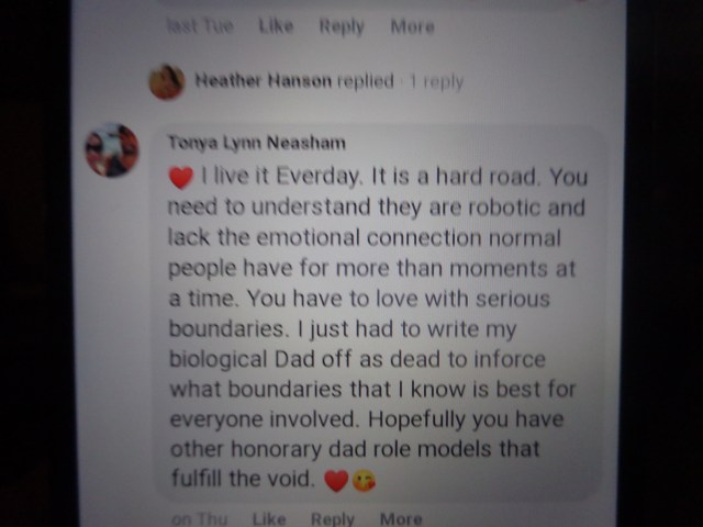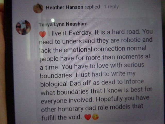Here are some responses from total strangers to the fake news I am mentally ill and un-treatable. One Witch says the mentally ill are “robotic” and it best to throw them away. Another says get rid of your father and find some Daddy Replacements, for the newborn child, or, Mommy Dearest?