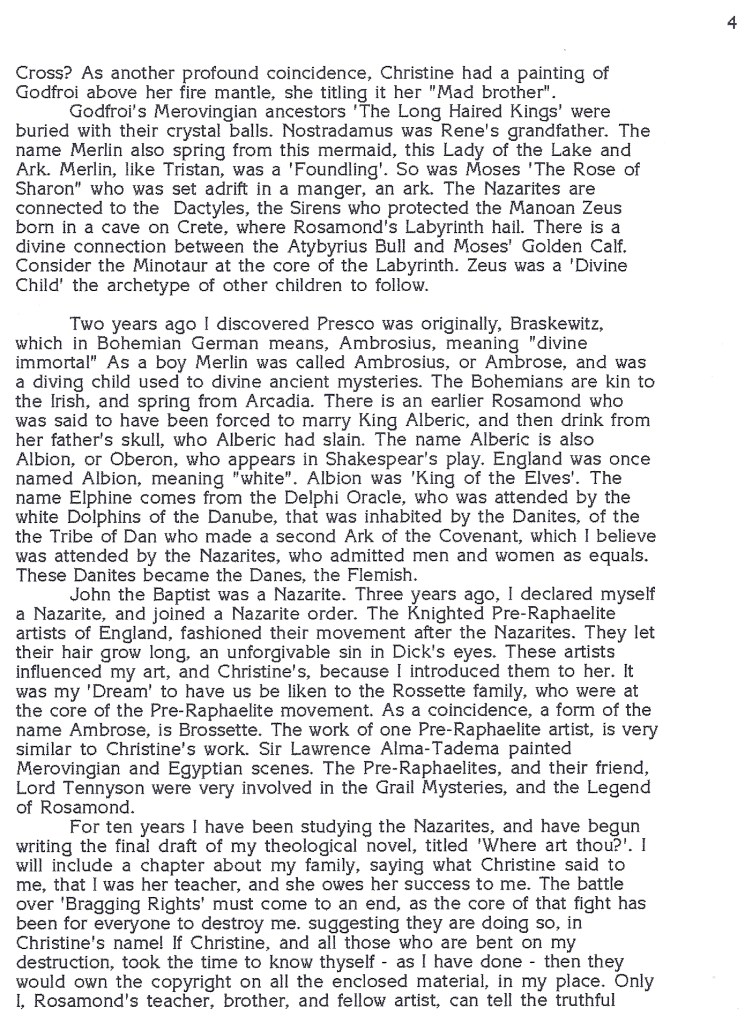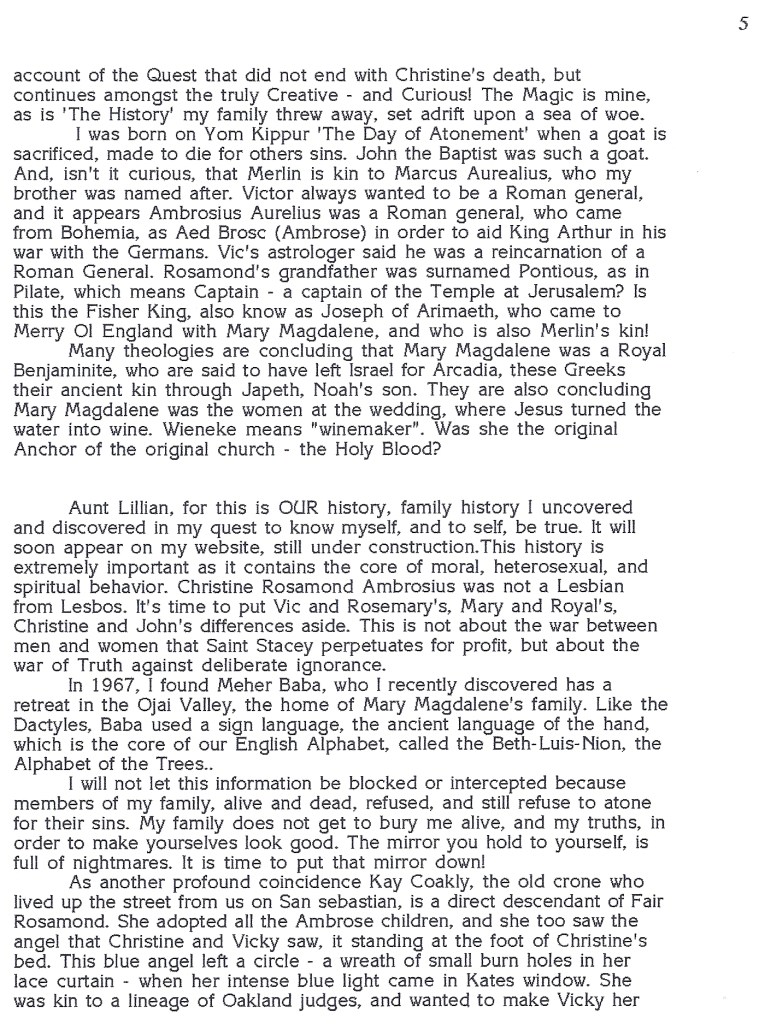 Here is the evidence that I was authoring a Grail Book, that established My Rose Line – years before Dan Brown came out with ‘The Da Vinci Code’. I sent some of this evidence to the Judge who oversaw the probate of my late sister, Christine Rosamond. Some letters may have been filed in the Supreme Court of Monterey. There is evidence my daughter’s mother, Patrice Hanson, wrote letters and sent e-mails while pretending to be my daughter, Heather Hanson. This is why Patrice favored Tom Snyder over me. I suspect her sister, Linda Comstock, and her attorney husband, were advising Patrice to get as close to the outside handler/caretakers of the Rosamond Legacy, surmising this is where the money is via the book and the movie – that Sydney Morris approved of, in regards to Stacey Pierrot. Heisinger, Morris, Rose, and Buck – backed a real loser!