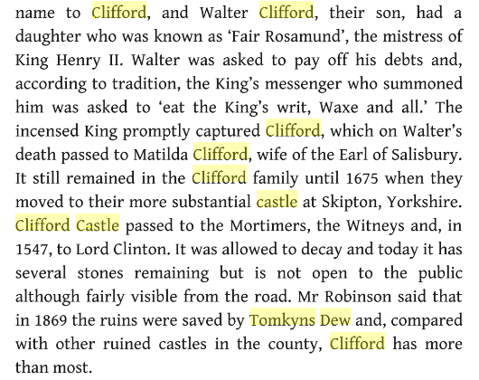 Clifford is named – Clifford Castle – Clifford Priory – wooden effigy – Fair Rosamund – the Clifford family – John Giffard – Clifford as a market centre – Clifford’s collapse