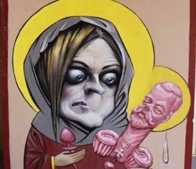 In one of Lopatin’s artworks, Poklonskaya appears as a nun in a Russian Orthodox icon and is holding a bust of Tsar Nicholas II in the shape of a sex toy.