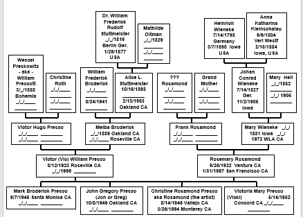 This is not a happy, healthy, or sane family that got rooted at 3106 13th. Avenue in Oakland California. Gertrude Stein lived right down the street. William Byer, Rudolph Stuttmeister, and his son William, built houses in Fruit Vale a city that became a part of Oakland. Oscar Presco and his son were contractors who lived in Marin and San Anslemo. Don Presco built a sailboat and raced in San Francisco Bay.