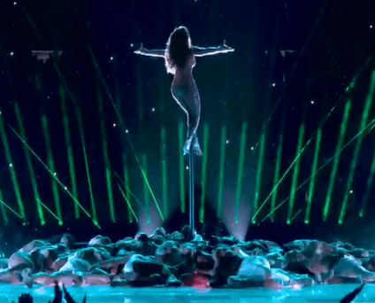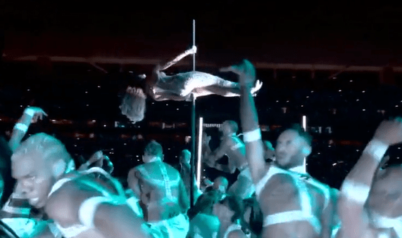 And they played politics. Emme and other children sang from glowing structures that resembled cages. On the flip side of the Puerto Rican flag—it was actually a feather coat swaddling J. Lo like paper grass around an Easter Egg—was the flag of the U.S., whose president has neglected and belittled its own territory in a moment of crisis. At the same time, J. Lo’s “Let’s Get Loud” intertwined with Bruce Springsteen’s “Born in the USA,” which was sung by Emme. Solidarity, pride, and the notion that unity complements diversity: These themes were communicated less via slogans than as fundamentals of the show itself, baked into the sound and look and meta-narrative.