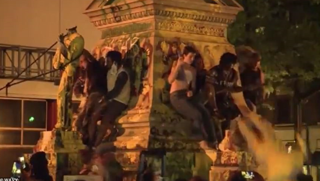 She said the statute came down during a demonstration. At 10:12 p.m. her department tweeted that people should stay away from the area of the monument