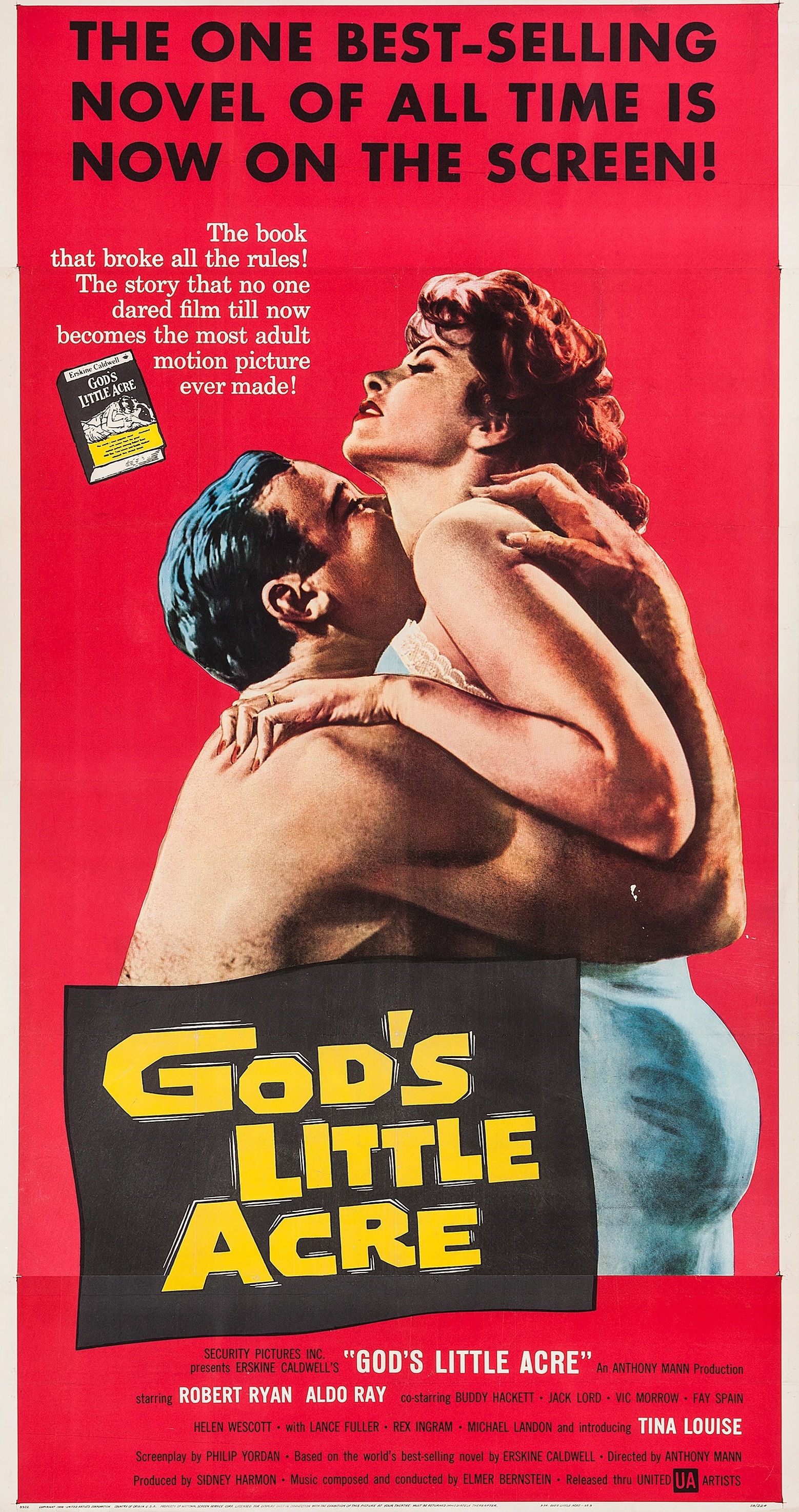 God’s Little Acre is a 1933 novel by Erskine Caldwell about a dysfunctional farming family in Georgia obsessed with sex and wealth. The novel’s sexual themes were so controversial that the New York Society for the Suppression of Vice asked a New York state court to censor it. Although controversial, the novel became an international best seller with over 10 million copies sold,[1] and was published as an Armed Services Edition during WWII. God’s Little Acre is Caldwell’s most popular novel, although his reputation is often tied to his 1932 novel Tobacco Road, which was listed in the Modern Library 100 Best Novels.[1] God’s Little Acre was later adapted as a 1958 film starring Robert Ryan.