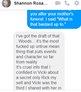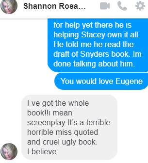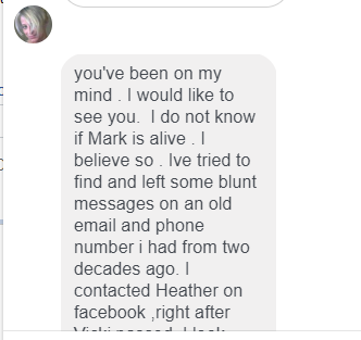 Shannon wanted to come get me to go together at Vicki’s bedside. Nine months ago, my sister suffered a brain aneurism that rendered her a vegetable. Vicki died. Shannon ended up with her papers which show her aunt stabbed her in the back. My niece is in possession of another bio and a screenplay Vicki and Mark could not sell, wherein the sexual abuse of children is discussed.