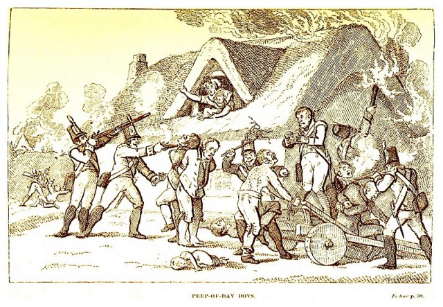 The Peep o’ Day Boys was an agrarian Protestant[1] association in 18th-century Ireland. Originally noted as being an agrarian society around 1779–80, from 1785 it became the Protestant component of the sectarian conflict that emerged in County Armagh, their rivals being the Catholic Defenders.[2][3] After the Battle of the Diamond in 1795, where an offshoot of the Peep o’ Day Boys known as the Orange Boys defeated a force of Defenders, the Orange Order was instituted, and whilst repudiating the activities of the Peep o’ Day Boys, they quickly superseded them.[3][4] The Orange Order would blame the Peep o’ Day Boys for “the Armagh outrages” that followed the battle.[5]