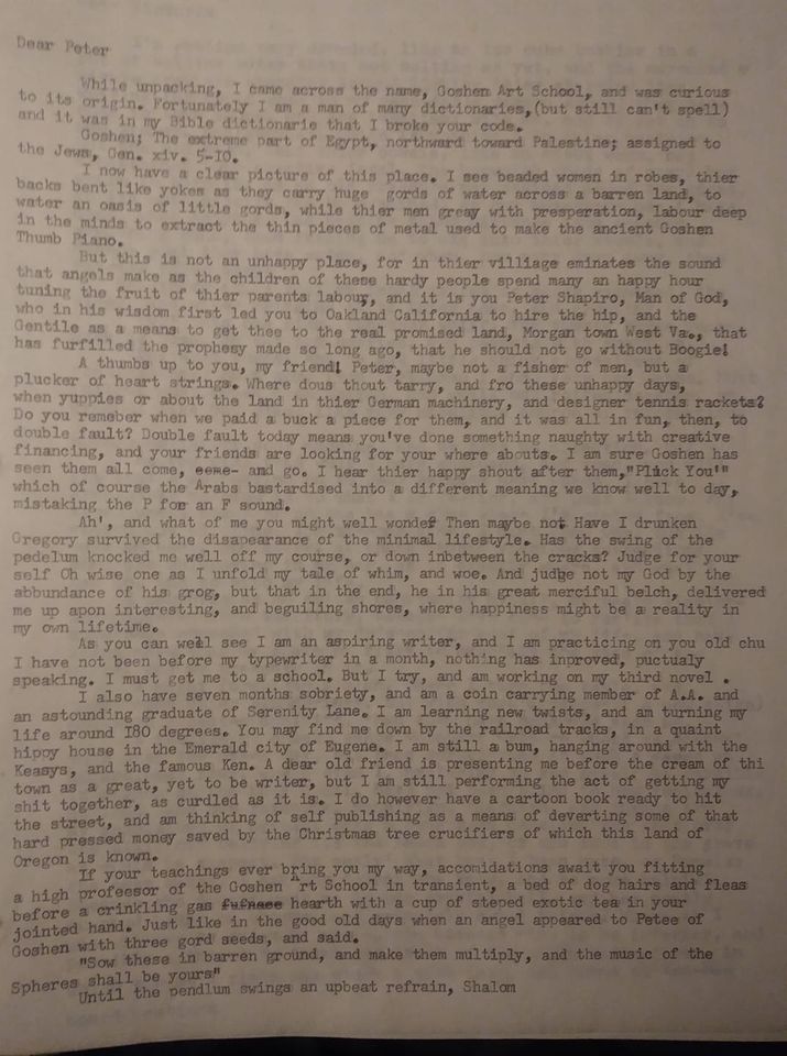 Here is the letter I wrote Peter when I had seven months sobriety. I was living with the head of a famous Eugene Kalimba band in Eugene. Peter made Kalimbas in Oakland and Morgantown. He would plant gourds in all his friends backyards. He would harvest them and make his famous thumb gourd thumb pianos. When I lived with him in another house in Oakland, he bought me a quart of beer if I grinded keys for an hour. I did the painting of Rena here that inspired my sister to take up art.