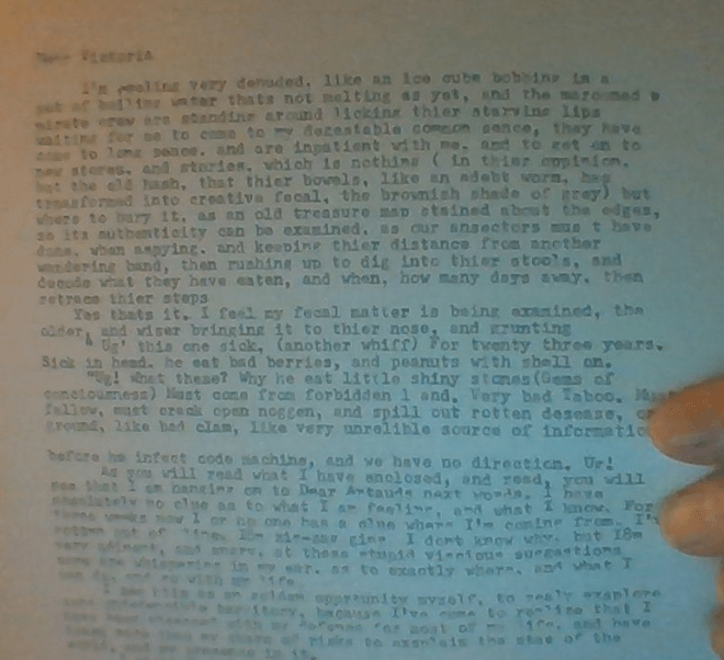 “As you will read what I have enclosed, and read, you will see that I am hanging on to Dear Artaud’s next words. I have absolutely no clue as to what I am feeling, and what I know. For three weeks now I nor anyone has a clue where I am coming from.”