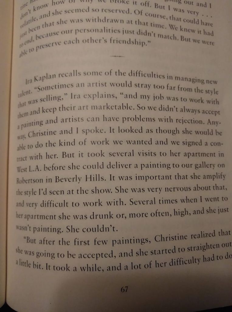 Respecting the Last Wishes is vital in any Will and Legacy. Let me assure you, that my late sister, Christine Rosamond Benton, never dreamed this vile and evil paragraph would ever appear in a book about her life. I’ve read this killing of a artist a half-dozen times. It activates my PTSD like no other words in Tom Snyder’s slanderous book. Anyone who knows anything about ART, knows these words utterly destroys Rosamond’s reputation. It is alleged Ira Kaplan developed Christine’s style, and controlled the style of sixty other artists he was exploiting – FOR MONEY! The true name of the gallery owner is Ira Cohen. For several months I have been taking an inventory to see how many family members had anything nice to say about a world famous female artist. Her two daughters – are still mute – as is Mark Presco. Shamus Dundon said nothing. Vicki claims she is – LIKE THE HEIR! Let me begin with this. Come back as I EXPOSE these DARK MONSTERS who hate Art and Artists.