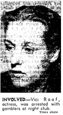 In December 1950, local cops swept up a rat king of drunken gamblers after an early morning brawl inside the Encore, resulting in the feds calling a pair of long-sought men to appear before the Kefauver Senate Crime Investigating Committee. Invited to Washington were Elmer “Bones” Remmer (San Francisco) and Thomas J. Whalen (East Saint Louis). With them in the Encore, and booked on charges of intoxication were Edmund M. Scribner (Bakersfield tavern keeper) and redheaded Miss Vici Raaf, actress.