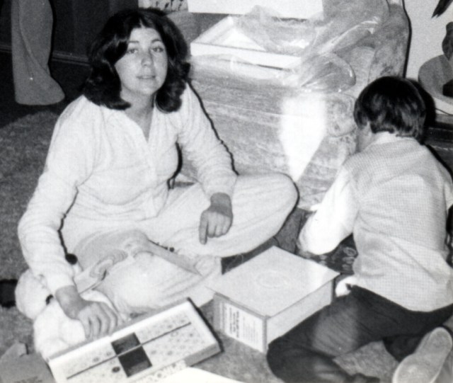 In the top photo we see Jeremy;s father, Michael Dundon, with Christine. He takes credit for Christine’s success, as does Jim, because they brought Industry to the Prescos. On her fifteenth birthday, Jim gave my sister a set of leather-working tools. Above we see Vicki with her Christmas gift given to her by the next task master she married. It is a Commodities’ Investment Kit complete with a big book on how to conceal one earnings from the IRS. Shamus is examining his new roofing hammer that he will expertly use putting a new roof on the house, come spring.
