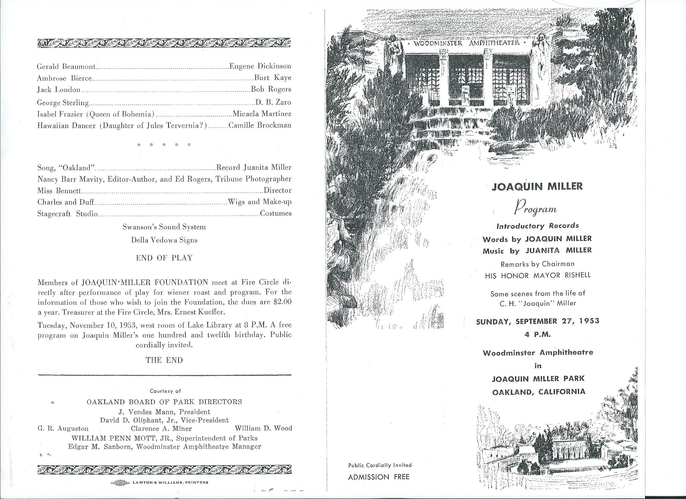“Since I left California in 1900 for New York and London I have seen many other cities more big and more prosperous, but my mind always returned to Miller Heights (Hights) where my poetry first began to grow amid the roses and carnations which Miller and I watered tenderly. … He was my first friend in American life. … He looked on me as his American son.”