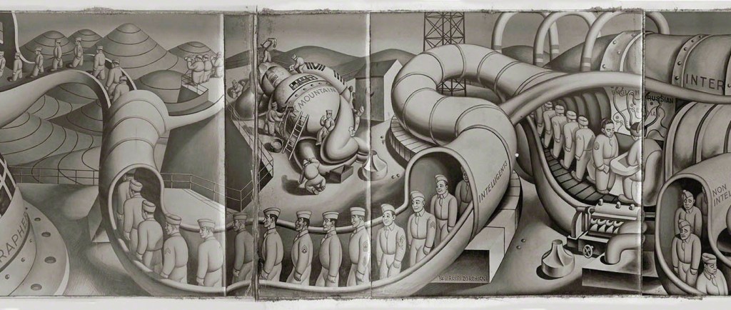 Beyond the “junkyard” is a rich history that son Alan is keen to preserve and protect. The Zorthian siblings have made concerted efforts to keep a recorded history of their family’s work, and have photographs of their father’s murals in humidity controlled containers. As to where some of the original ones are, like the “Phantasmagoria of Military Intelligence Training,” they have no idea. While converting this photographed mural to a digital format, Alan emphasizes, “We would love to know where it is! It’s a 157-foot mural documenting the process of people in training preceding the formation of the CIA.”
