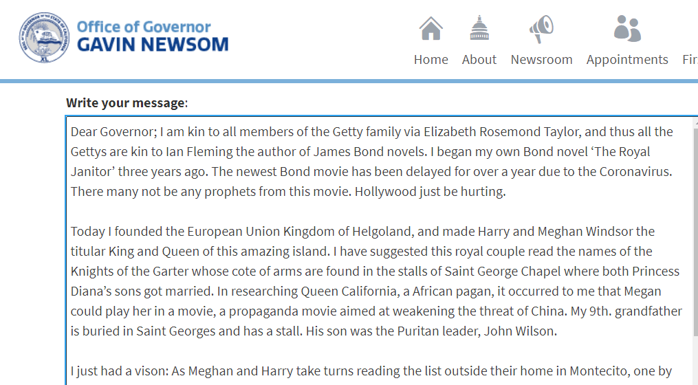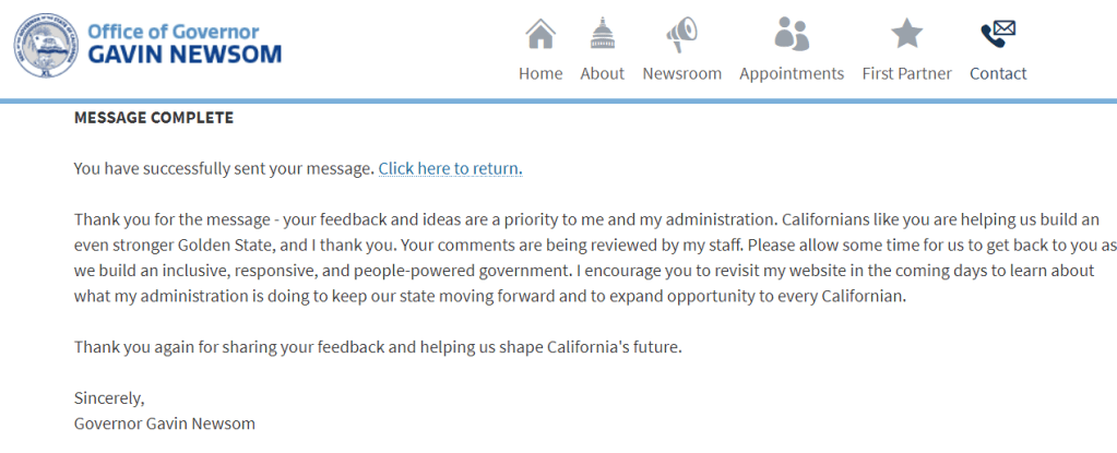 Here is the e-mail I sent Gavin Newson, the Governor of California.