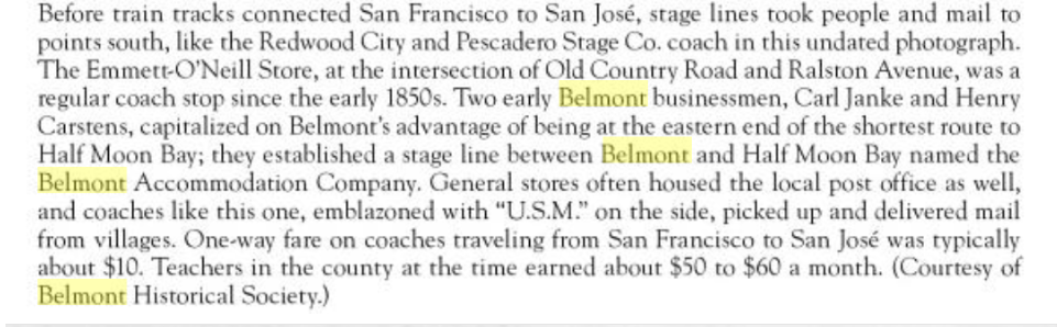 My great grandfather’s sons owned a stagecoach company, called The Belmont Accommodation Company. It took folks from Belmont to Half Moon Bay and back.