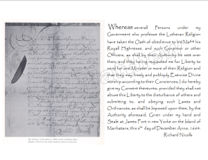 Under his “hand and seal,” the first British Governor of New York, Richard Nicolls, gave to our forebears in the faith, the early Lutheran settlers and founders of the Congregation of the Unaltered Augsburg Confession of Faith on the island of Manhattan, the right to “freely and publicly exercise divine worship according to their consciences.” This notable event, almost 150 years after the birth of the Lutheran Reformation on October 31, 1517, is a testimony to the truth of the enduring Word of scripture, as is written in the closing verses of Psalm 90: Make us glad for as many days as you have afflicted us, and for as many years as we have seen evil. Let your work be shown to your servants, and your glorious power to their children. Let the favor of the Lord our God be upon us, and establish the work of our hands upon us; yes, establish the work of our hands!