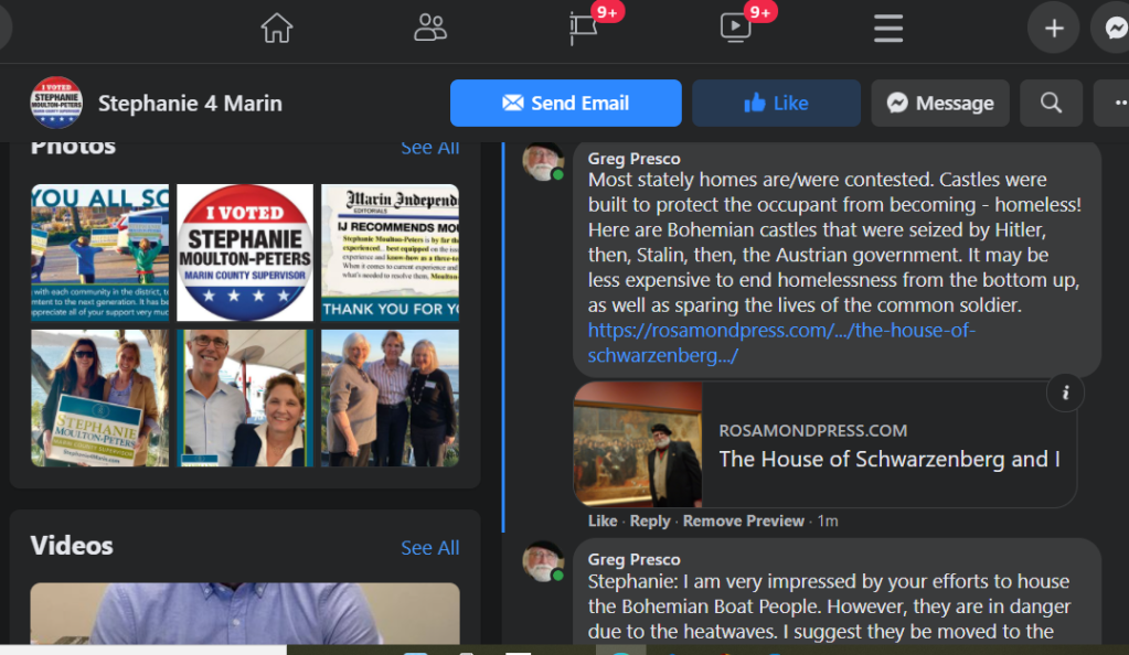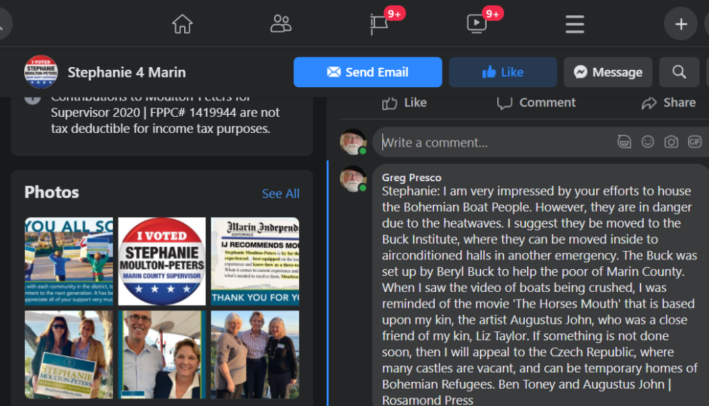 Stephanie: I am very impressed by your efforts to house the Bohemian Boat People. However, they are in danger due to the heatwaves. I suggest they be moved to the Buck Institute, where they can be moved inside to airconditioned halls in another emergency. The Buck was set up by Beryl Buck to help the poor of Marin County. When I saw the video of boats being crushed, I was reminded of the movie ‘The Horses Mouth’ that is based upon my kin, the artist Augustus John, who was a close friend of my kin, Liz Taylor. If something is not done soon, then I will appeal to the Czech Republic, where many castles are vacant, and can be temporary homes of Bohemian Refugees. Ben Toney and Augustus John | Rosamond Press
