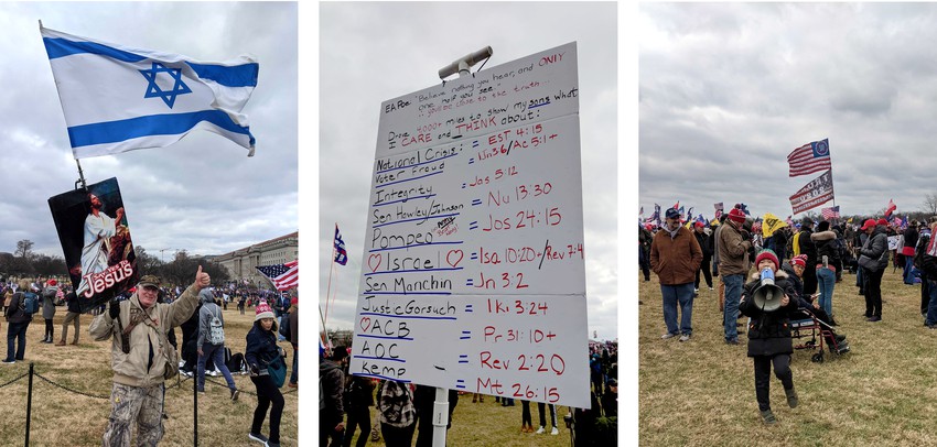 he name of God was everywhere during Wednesday’s insurrection against the American government. The mob carried signs and flag declaring jesus saves! and god, guns & guts made america, let’s keep all three. Some were participants in the Jericho March, a gathering of Christians to “pray, march, fast, and rally for election integrity.” After calling on God to “save the republic” during rallies at state capitols and in D.C. over the past two months, the marchers returned to Washington with flourish. On the National Mall, one man waved the flag of Israel above a sign begging passersby to say yes to jesus. “Shout if you love Jesus!” someone yelled, and the crowd cheered. “Shout if you love Trump!” The crowd cheered louder. The group’s name is drawn from the biblical story of Jericho, “a city of false gods and corruption,” the march’s website says. Just as God instructed Joshua to march around Jericho seven times with priests blowing trumpets, Christians gathered in D.C., blowing shofars, the ram’s horn typically used in Jewish worship, to banish the “darkness of election fraud” and ensure that “the walls of corruption crumble.”