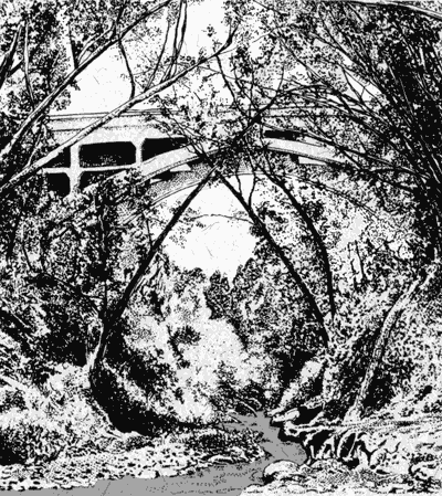 Outside the pavilion, the park provided a carousel for children, footpath bridges crossing the meandering of creeks, and a shooting gallery, with picnic benches and lathe houses situated about the shady grounds. Brass bands performing from bandstands could be heard all around the woodland.