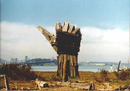 My friend of bygone days, Bill Jackson—sometime teacher, poet, electrician, photographer—took it upon himself to photograph the ever-shifting display of art. (I’m sure he wasn’t the only one, but he was the one I knew.) I still have one of his photos somewhere—of the huge drowning, clutching hand rising from the tidelands, photographed through a red filter at sunset. One day, sitting in the Med, when it was still the caffeine-crossroads of all kinds of Berkeley folks, he told me that he had sold huge enlargements of his photos to the City of Emeryville, to be hung on the walls of their little City Hall. “What they paid me is no more than what it’ll cost me to have such enlargements made, but, oh, hell . . .” He was very pleased at even this recognition. “You ought to go see them!”