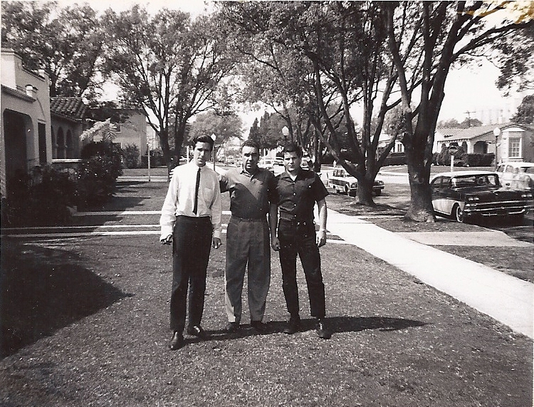 I am standing with my uncle and brother with a cast on my hand. Vinnie and June would give me their Ford Fairlane that is parked at the curb.