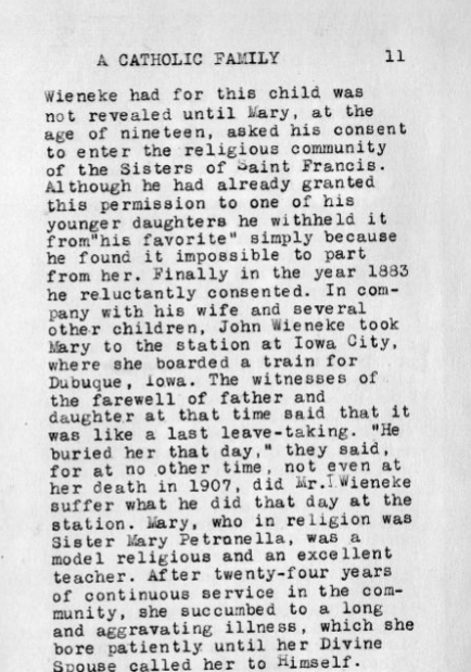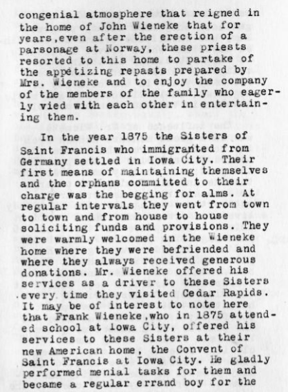 - Above is a photo of the Wieneke farm in Iowa. Here Sisters of the Order of Saint Francis were grounded in America after they were forced to flee Germany due to Bismark’s Kulturkampf. This is a story of how a religious order was helped by an American family who had immigrated from Germany fifty years before. The Wieneke family was given credit for preparing the way for Saint Francis, and, Jesus Christ.