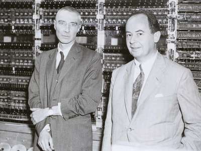 During World War II, von Neumann worked on the Manhattan Project with theoretical physicist Edward Teller, mathematician Stanislaw Ulam and others, problem-solving key steps in the nuclear physics involved in thermonuclear reactions and the hydrogen bomb. He developed the mathematical models behind the explosive lenses used in the implosion-type nuclear weapon and coined the term “kiloton” (of TNT) as a measure of the explosive force generated. After the war, he served on the General Advisory Committee of the United States Atomic Energy Commission, and consulted for organizations including the United States Air Force, the Army’s Ballistic Research Laboratory, the Armed Forces Special Weapons Project, and the Lawrence Livermore National Laboratory. As a Hungarian émigré, concerned that the Soviets would achieve nuclear superiority, he designed and promoted the policy of mutually assured destruction to limit the arms race.