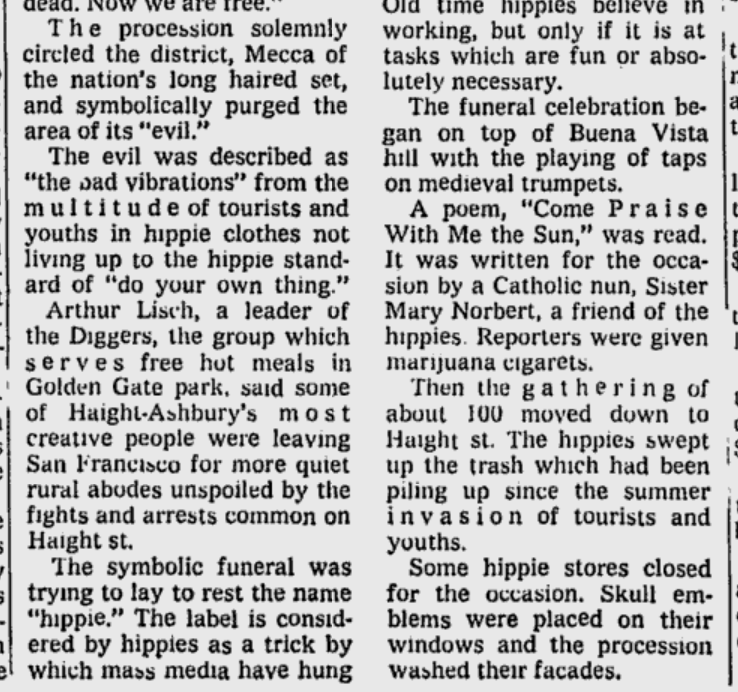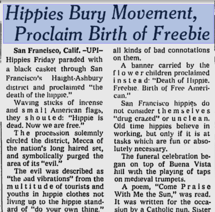 SAN FRANCISCO (UPI) Elders of San Francisco’s hippie community gathered today atop Buena Vista Hill to proclaim “the death of he hippie” with pomp and dramatics. As dawn brightened the splendid view, they ceremoniously complained that their famed Haight-Ashbury district has gone wrong. ‘ Then they moved down Haight Street, cleaning up trash, common since the summer invasion of tourists and thrill-seekers. Outside of some hippie shops, closed for the three-day funeral observance, were scrubbed with flourishes. Skirl) emblems tvere placed on windows. Later, a solemn funeral procession circled the district symbolically purging it of evil. Hippies were asked to drop things meaningful to them, feuch as their beads, in a huge coffin.