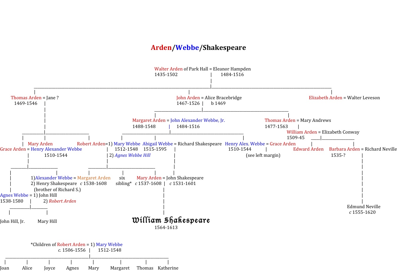 ARDEN NEVILLEWalter Arden (1437-1502) John Arden (1467-1526) Thomas Arden (? 1563) William Neville (1497-1545) = Elizabeth | | Greville. William, brother William Arden (d 1545) = Elizabeth Conway | of John Neville 1493-1543, | | John Neville = Catherine | | Parr in 1533. Barbara Arden (b 1535) = Richard Neville (1523-1590)Edmund Neville (1555-1629) Edward Arden (1533-1583) John Arden (1496-1526) Thomas 1469-1546) Robert Arden (abt 1497-1556) Mary Arden Shakespeare (1537-1608) William Shakespeare (1564-1616) William Arden (about 1479) Robert Arden about (1475-?) (Numerous sources. Most can be found in Tudor.com)
