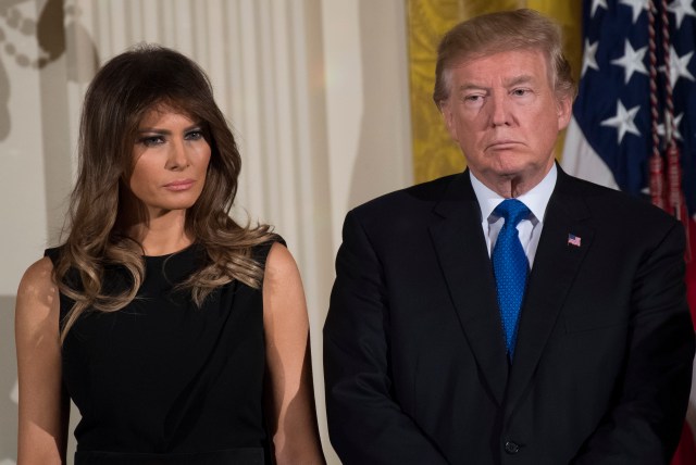 TOPSHOT – US President Donald Trump and First Lady Melania Trump attend a Hanukkah reception in the East Room of the White House in Washington, DC, December 7, 2017. / AFP PHOTO / SAUL LOEB (Photo credit should read SAUL LOEB/AFP/Getty Images)