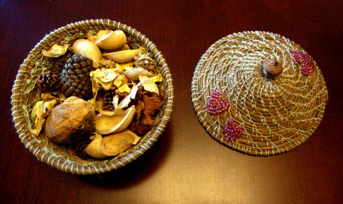 “Sorry. This is a briefing. Yes my Modoc sister in California wove me this basket. Natives would pop a pinecone seed in their mouth to produce saliva that would soften the seeds up, and eliminate water consumption. They were Breatharians, something I aspire to be. Weaving these baskets is a form of meditation and mathematics, with picture imaging of your relatives going back five generations. It is one of the most calming exercises known to man that came over the Ellucian Islands from ancient Tibet. Weaving can lead to enlightenment. I can teach you how to weave with your eyes closed using your third eye.”