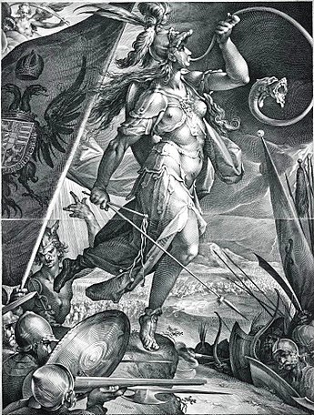 Often in poetry the name Bellona is used simply as a synonym for war, although in the Thebaid of Statius the goddess appears as a character, representing the destructive and belligerent aspect of war. There she is described as carrying a spear and a flaming torch or riding in a chariot and waving a blood-stained sword.[7] Classical allusions to Bellona later appear in Shakespeare‘s plays in the appropriate context of warrior characters: Hotspur describes the goddess as “the fire-eyed maid of smoky war”, for example,[8] and Macbeth is referred to as “Bellona’s bridegroom”,[9] that is to say, the equivalent of Mars.